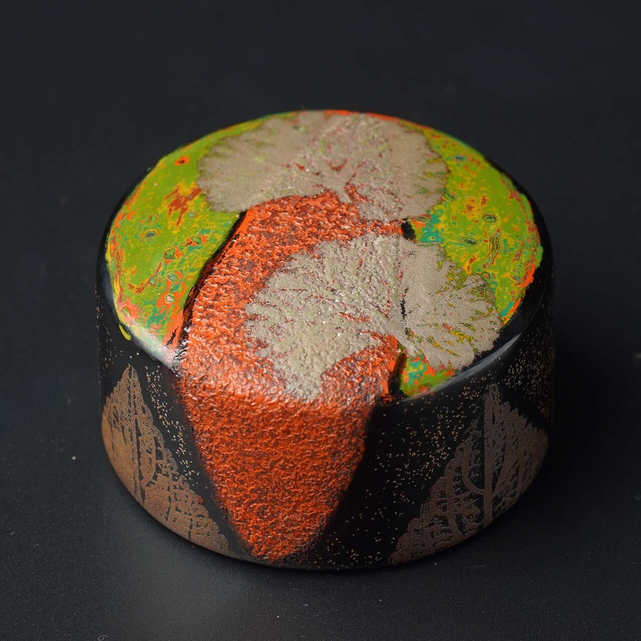 漆工芸において紙による素地を紙胎と言いますが、この作品は厚紙と木屑を固め、その中に鉛を入れ、書鎮としての重さを確保し、漆については呂色漆を塗り重ねた上に、我が家の周りの草花を転写した作品や変り塗りを施してあります。