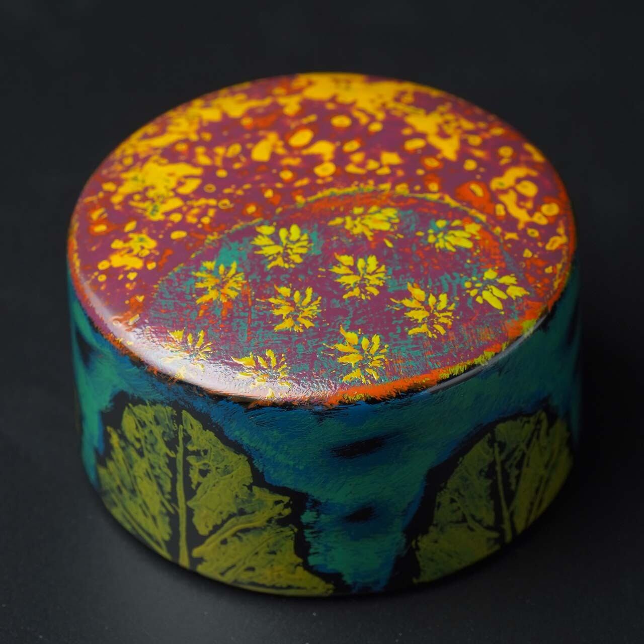 漆工芸において紙による素地を紙胎と言いますが、この作品は厚紙と木屑を固め、その中に鉛を入れ、書鎮としての重さを確保し、漆については呂色漆を塗り重ねた上に、我が家の周りの草花を転写した作品や変り塗りを施してあります。