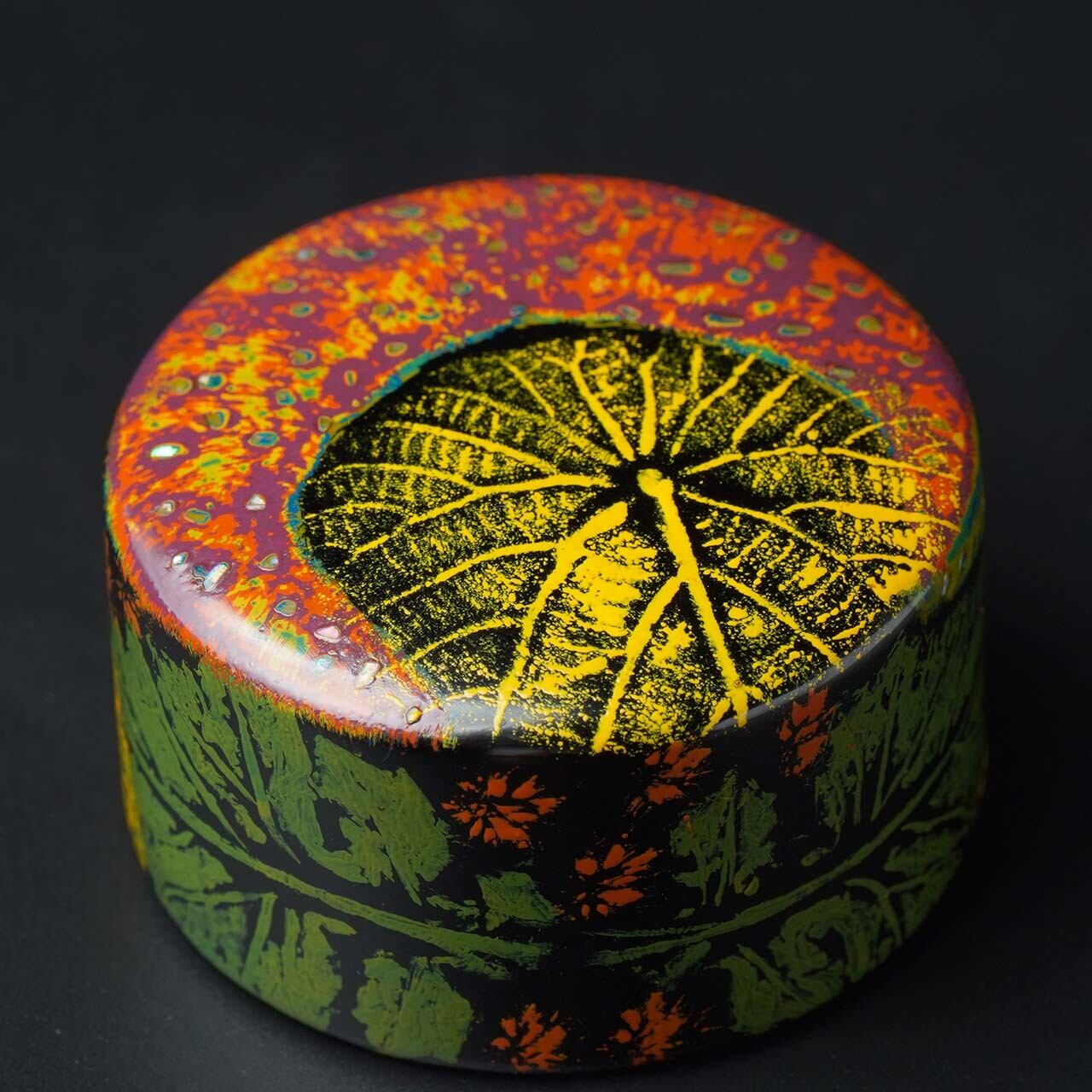 漆工芸において紙による素地を紙胎と言いますが、この作品は厚紙と木屑を固め、その中に鉛を入れ、書鎮としての重さを確保し、漆については呂色漆を塗り重ねた上に、我が家の周りの草花を転写した作品や変り塗りを施してあります。