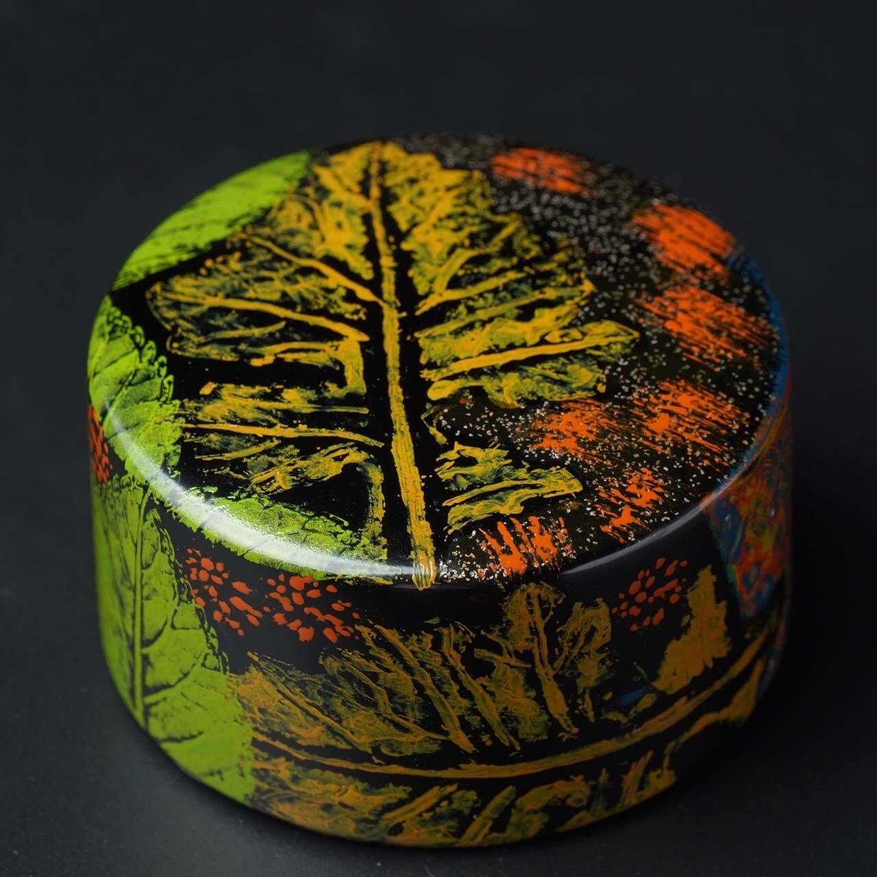 漆工芸において紙による素地を紙胎と言いますが、この作品は厚紙と木屑を固め、その中に鉛を入れ、書鎮としての重さを確保し、漆については呂色漆を塗り重ねた上に、我が家の周りの草花を転写した作品や変り塗りを施してあります。