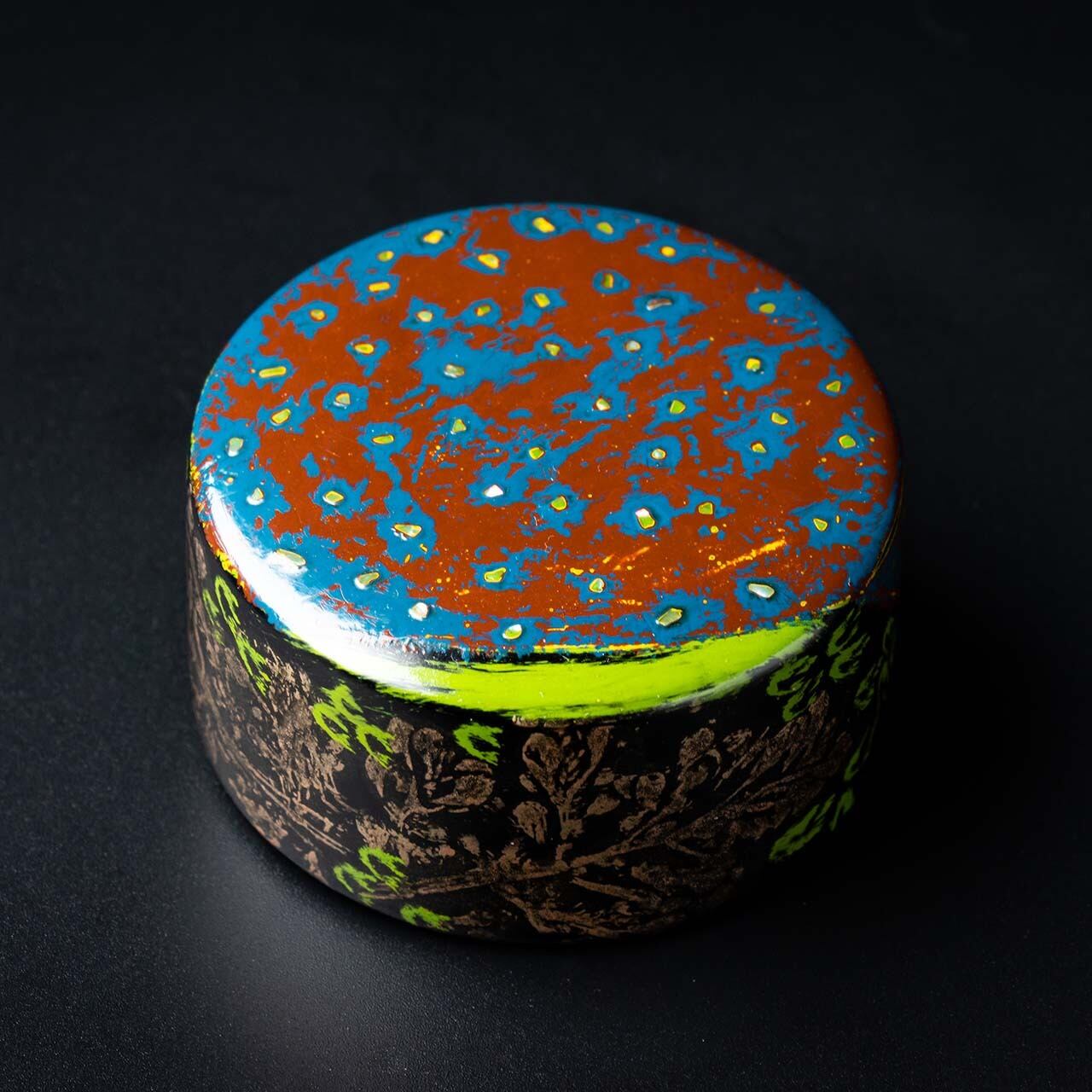 漆工芸において紙による素地を紙胎と言いますが、この作品は厚紙と木屑を固め、その中に鉛を入れ、書鎮としての重さを確保し、漆については呂色漆を塗り重ねた上に、我が家の周りの草花を転写した作品や変り塗りを施してあります。